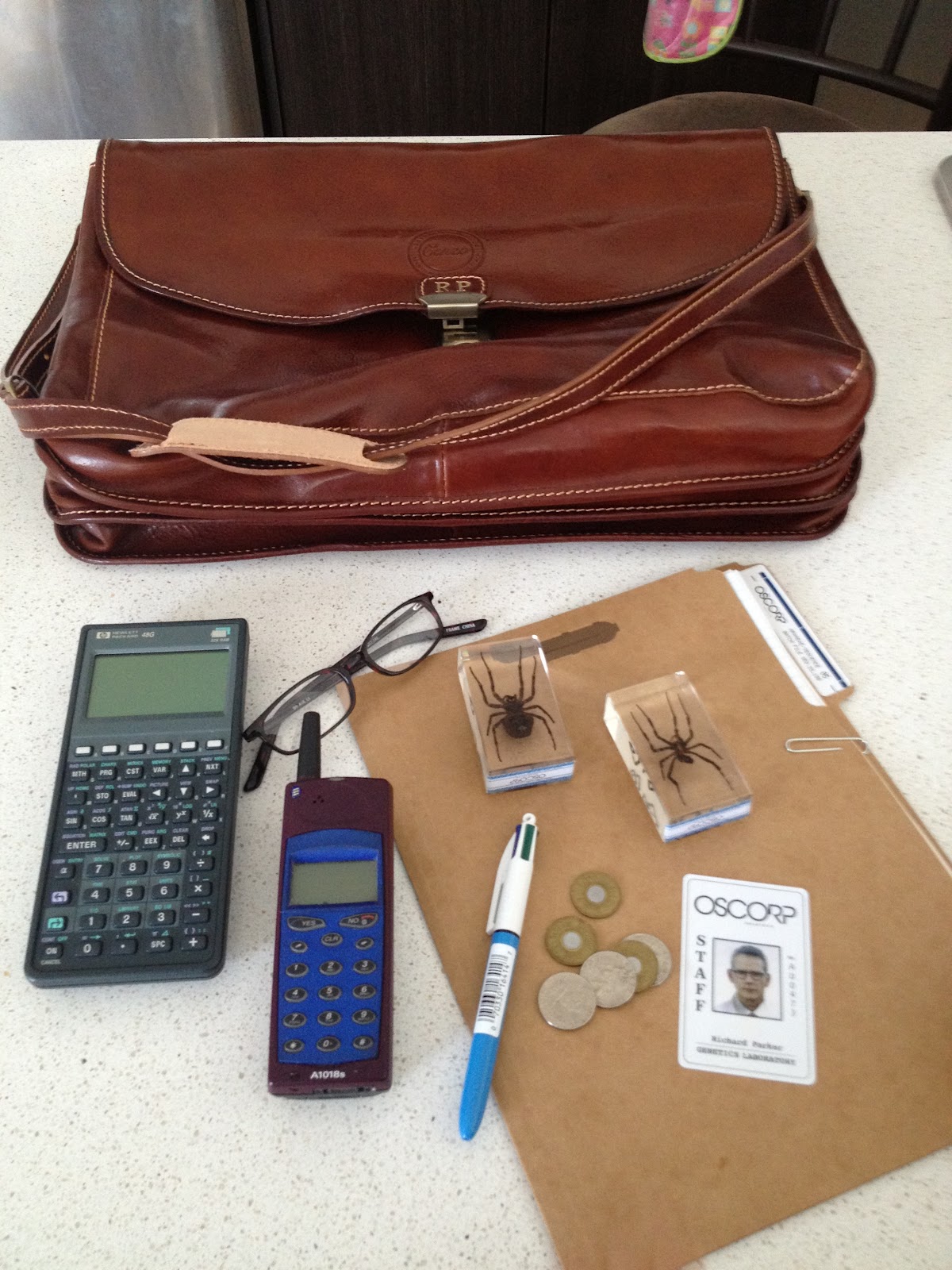 After work I went home and immediately started looking through the bag. Inside the bag there was: an old calculator, a cell phone, two spiders encased in glass, pens, a pair of reading glasses, some quarters and train tokens, Richard Parker’s Oscorp ID Badge.  I thought that was all, but then I saw a hidden zipper inside the back pocket.  When I opened it up there was a file folder inside with documents, overhead projector sheets with pictures of spiders and a picture of Richard Parker and Dr. Curtis Connors.