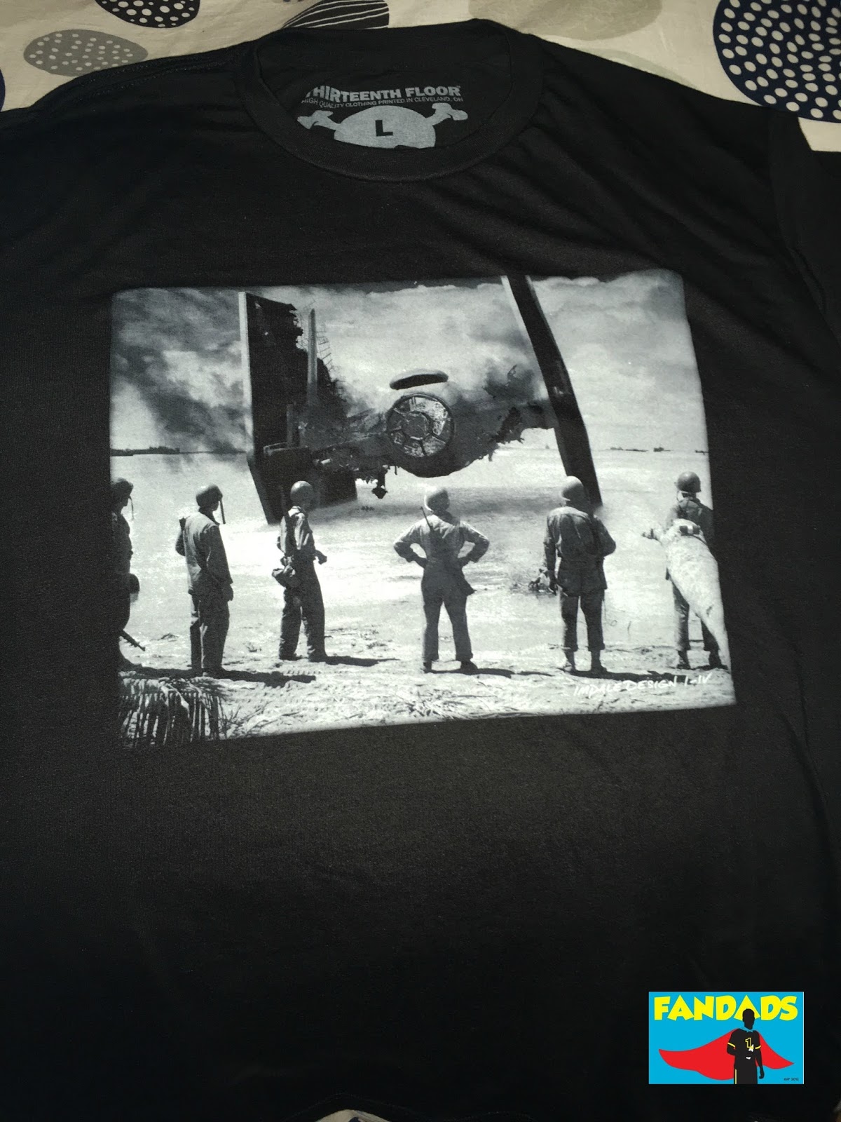 I really like their SWVSWWII designs because they have amazing photos from Wolrd War II with Star Wars characters or vehicles embedded in them. The shirt I bought has a group of soldiers looking at a downed Tie-Fighter. Check out their website when you can and look at their other designs.
