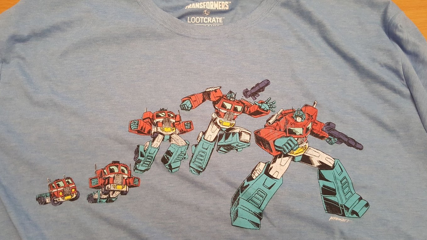 This beauty showed up today in our Loot Crate. Very timely as Transformers: The Last Knight is in theaters now! (Funny how that works) The Marvel Collector Corps box also had a nice shirt, but we’ll feature that one next week!